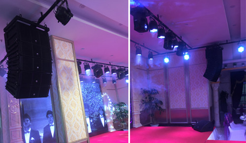 系统配置包括双8寸线阵音箱、cu12舞台返听音箱、MH-3000功放等设备,采用8+4线阵音响系统吊挂方式,经专业工程师安装调试,在技术上解决整个厅堂前后场声压级均匀度及混响问题 。