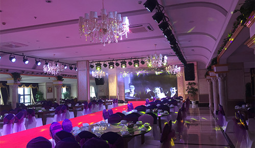 宴会厅采用专业的线阵音响系统、先进的多媒体系统及丰富的舞台灯光设备,可满足婚庆活动、大型演出、会议报告等音响扩声需求。如需提供专业的线阵音响系统请联系北京鸿景天瑞在线客服,提供专业声场设计、安装、调试及售后服务。