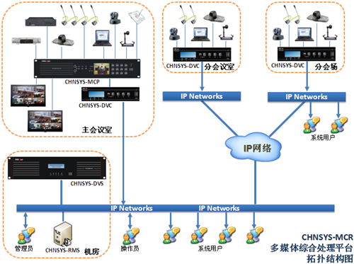 信息处理:信息处理主要通过多媒体录播服务器(CHNSYS-DVS)来完成,其负责多媒体会议室内编码器传送来的信息处理(编码器通过IP网络传送给服务器的信息),实现同步录制、实时直播和点播等功能。
